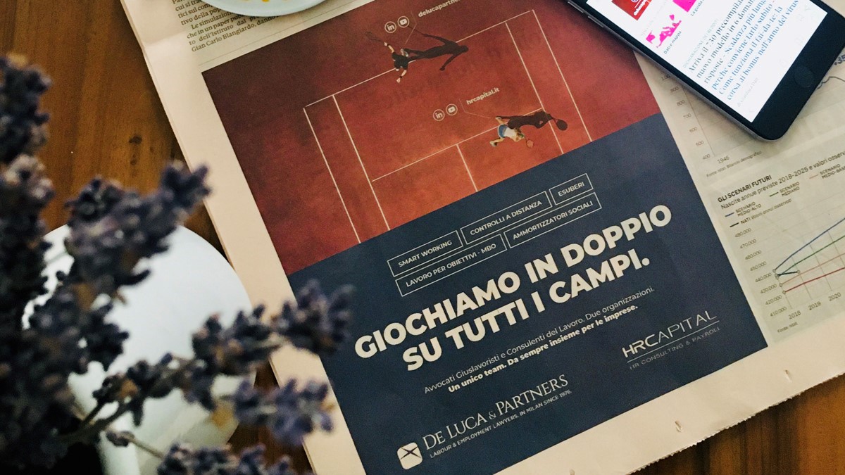 “Giochiamo in doppio su tutti i campi”: è questa la headline della nostra campagna pubblicitaria 2020. Dopo “Sì, pensiamo solo al lavoro”, il nostro studio torna in comunicazione però con una importante novità. In un momento in cui le imprese devono affrontare sfide sempre più importanti, presentiamo la nostra squadra al completo: un unico team che comprende non solo gli Avvocati Giuslavoristi di De Luca & Partners, ma anche i Consulenti del Lavoro della consociata HR Capital S.r.l..